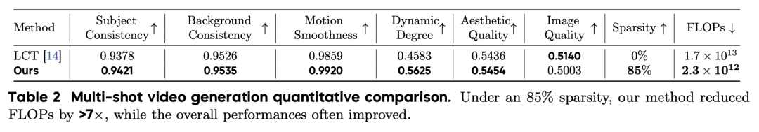 多镜头64秒(8×8秒)的480P视频中,基线为1.7×10¹³FLOPs,而MoC只用2.3×10¹²FLOPs,同样节省约86%。