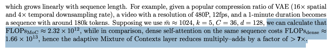 使用MoC机制生成一分钟的480P视频,仅需消耗2.32×10¹²FLOPs的计算量,而基线模型需要1.66×10¹³FLOPs,MoC将计算量削减了85%。