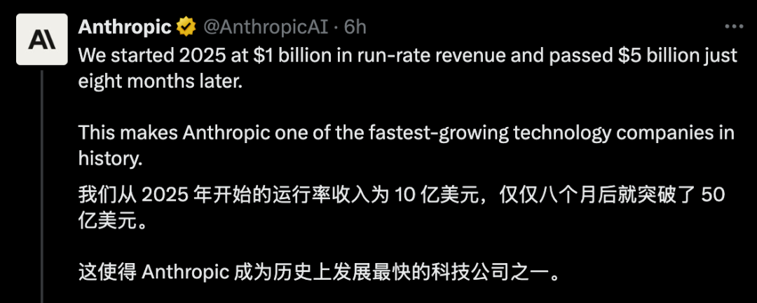 融资之外,Anthropic的业务造血能力也被进一步披露。短短半年时间,公司营收从10亿美元年化,一跃突破50亿美元。其中最核心的AI编程业务Claude Code年收入更是突破5亿美元。