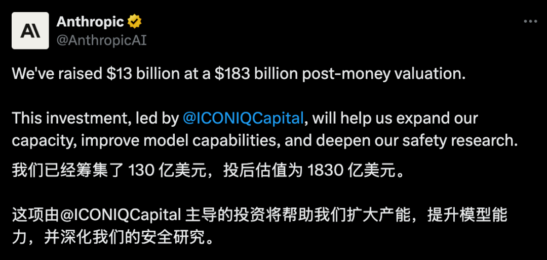 实际上,Anthropic开启新一轮融资以来,市场热情高涨,融资和估值也被一路推高,最终完成了130亿美元的单轮融资巨额。