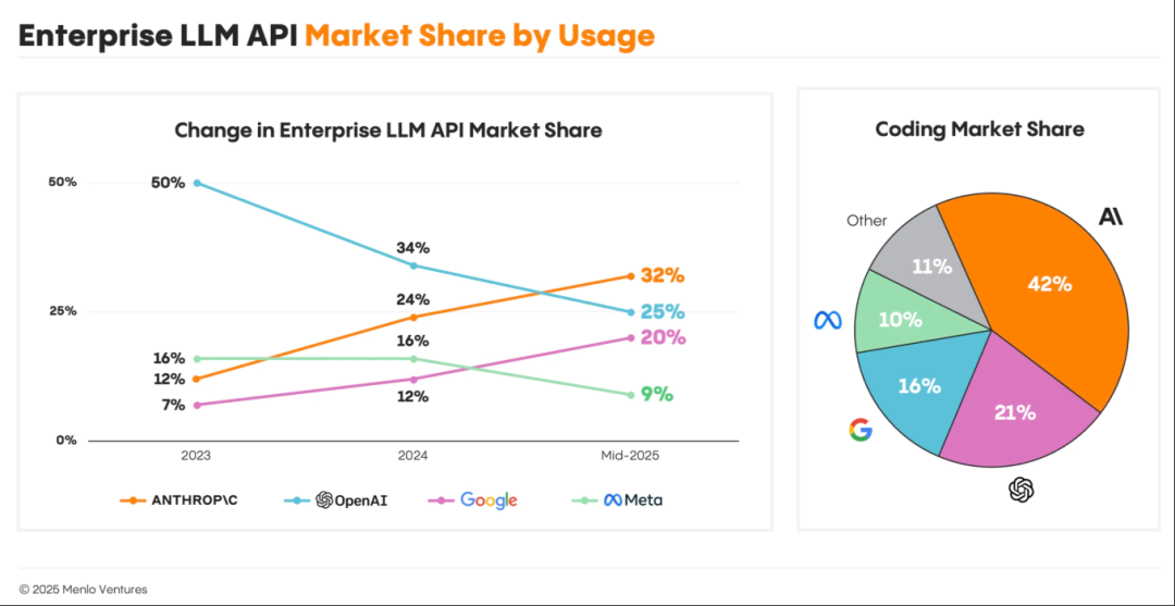 风投机构Menlo Ventures的《2025年年中LLM市场更新》中就提到,代码生成已经成为AI的首个突破性用例,而Claude的提供方Anthropic,正在成为这一市场的新领导者:
