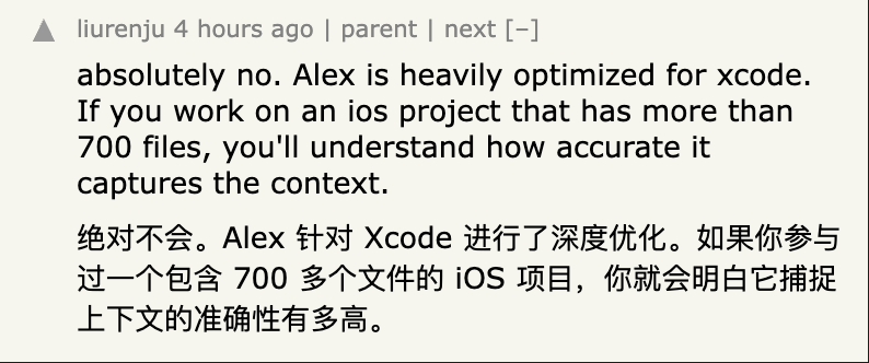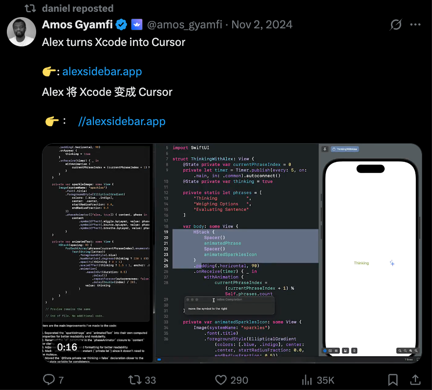 2024年10月,Alex开始测试,当时就让不少苹果应用开发者惊呼:Alex将Xcode变成了Cursor!