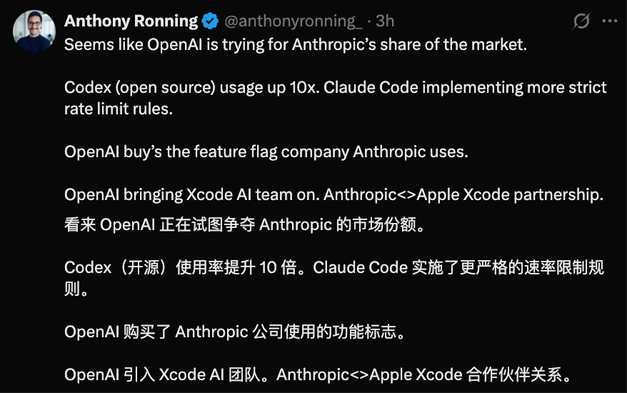 虽然前者名头不似Windsurf那般响亮,但确实,OpenAI在编程领域和老对手Anthropic的竞争,又添一枚重磅筹码。
