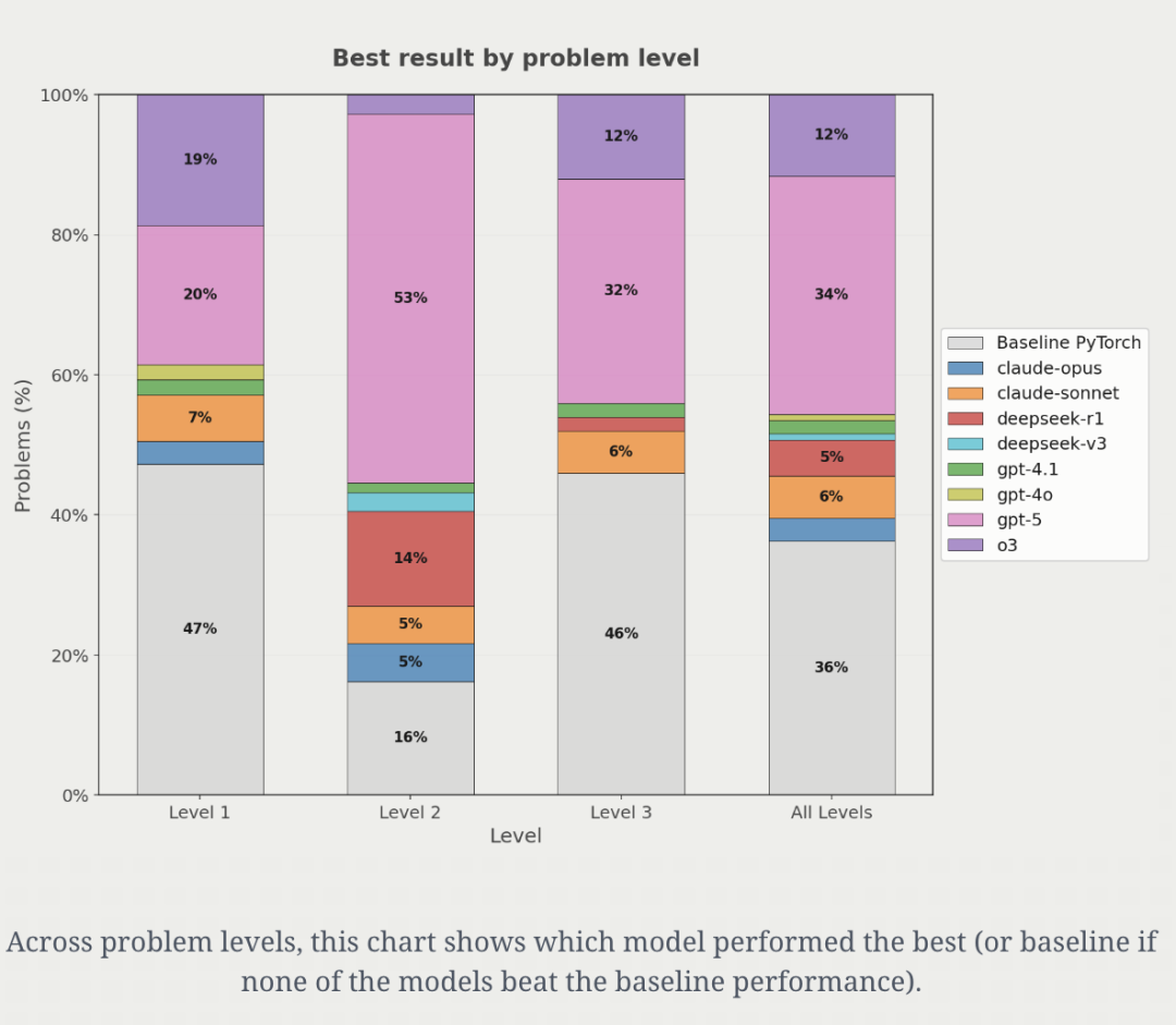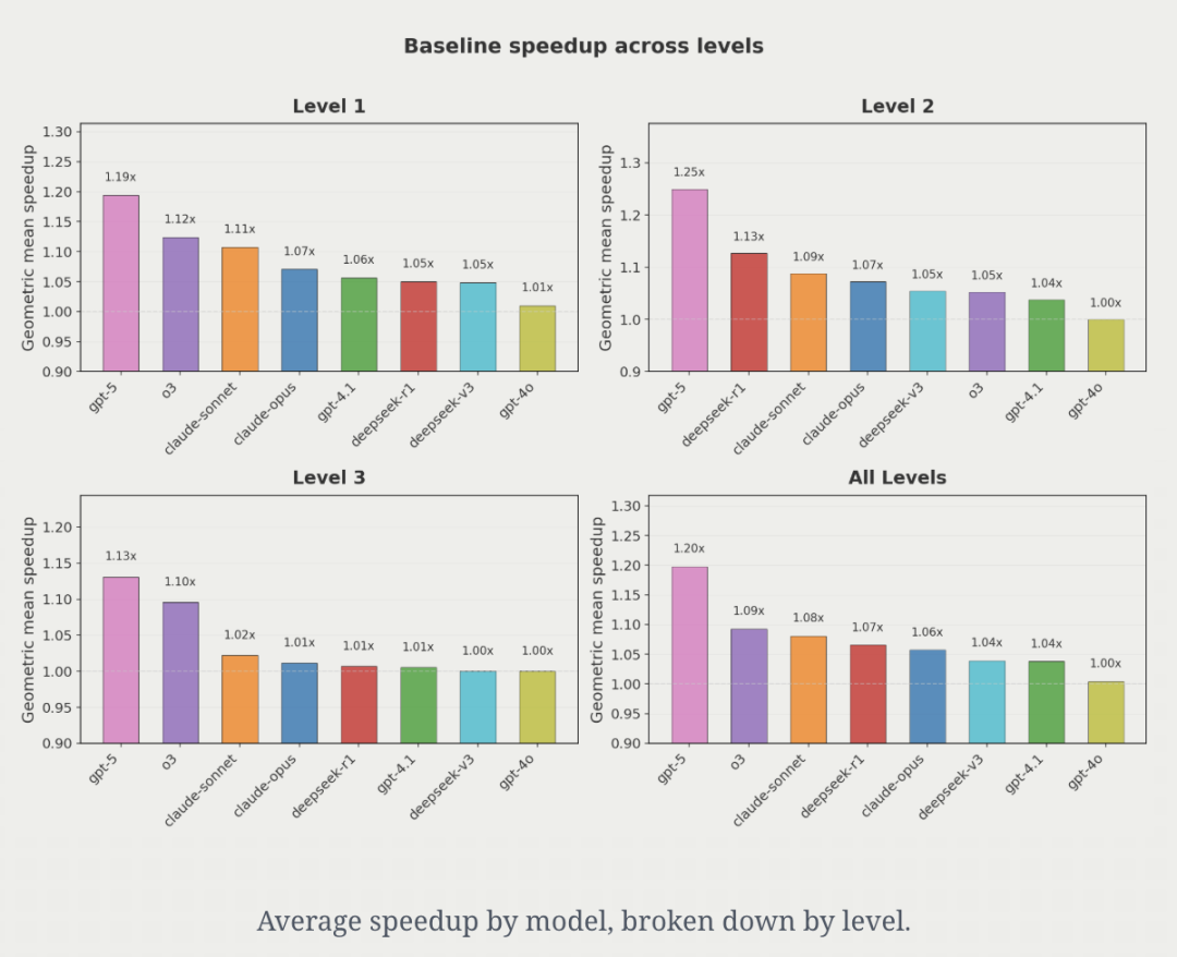 总体而言,GPT-5平均可以带来约20%的加速,其他模型则落后。