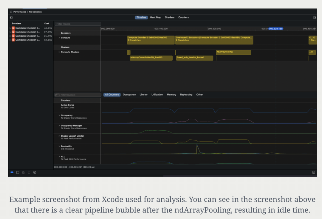 M4上gputrace 的性能分析信息。(包含Apple Script捕获的gputrace摘要、内存和时间线视图)