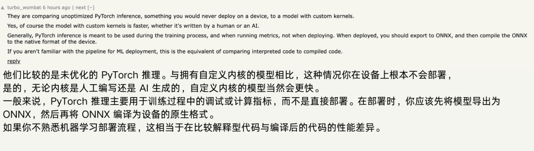 不少眼尖的网友也是发现并指出了这一点:文章里所用的baseline是eager mode,这通常只用于训练调试或指标计算,不会被真正部署到设备上。