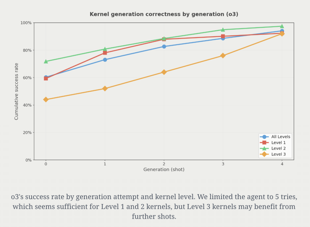 实验表明,正确性会随着尝试次数的增加而提升。以o3为例:第一次尝试就有约60%的概率得到可用实现,到第5次尝试时可用实现比例达到94%。