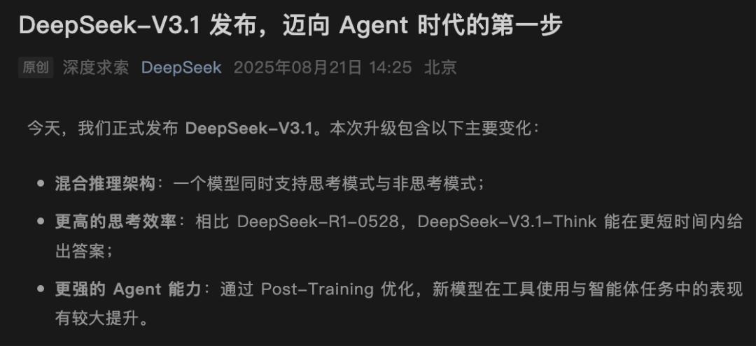 在DeepSeek 8月的最近一次更新中,DeepSeek-V3.1上线。官方发布的升级公告中就提到: