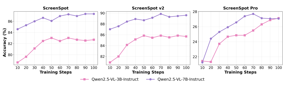 并且随着训练步数的增加,模型在三个基准上的表现都有稳定的提升,进一步证明了GUI-RCPO的泛化能力。