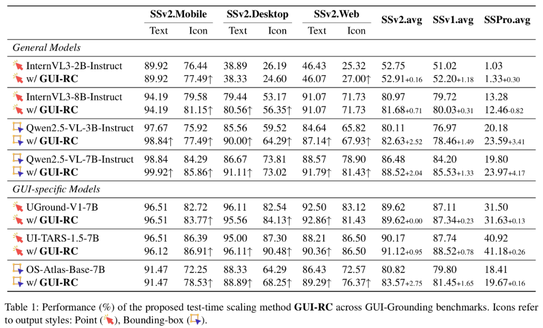 研究团队将GUI-RC和GUI-RCPO两种方法分别应用到不同的通用模型和GUI专用模型上,并在三个主流的GUI定位基准上进行了全面的评估。