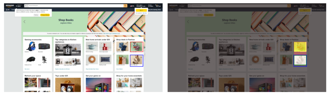 在一个电商界面里,用户指令要求GUI智能体在时尚购物区中查看低于50美元的鞋子(图片中蓝色方框框选的区域),而在贪心解码策略下,模型却被相近的语义与版面布局迷惑,错误地框选到了“低于25美元的上衣”区域(左侧图片中红色方框框选的区域),这是典型的语义错配导致的误导性幻觉。