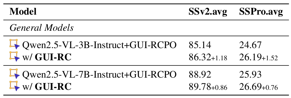 此外,GUI-RCPO对于已经在GUI任务上进行过预训练的模型仍然会带来进一步的提升,证明了方法的有效性。