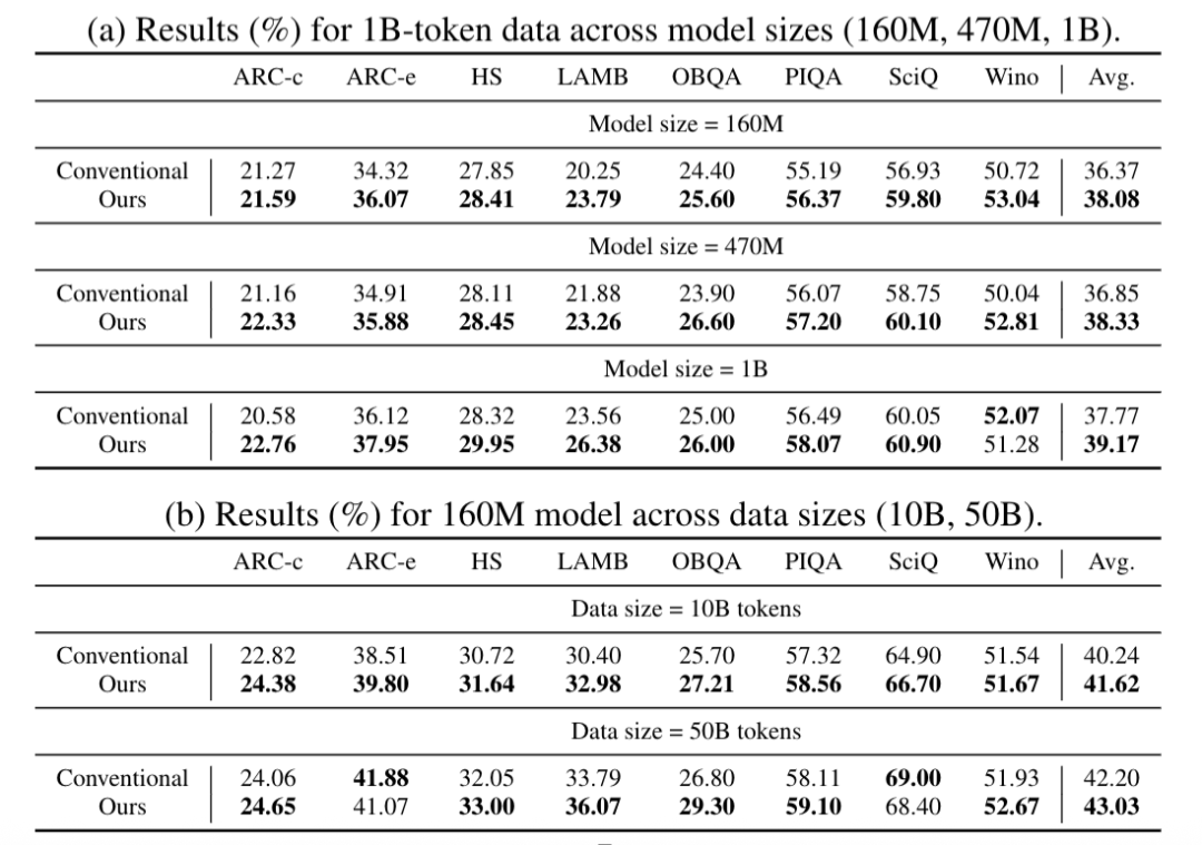 与传统随机排序方法相比,DELT范式不仅通过减小数据规模提升了训练效率;而且在不同模型尺寸和数据规模下,在各种评测集上都显著提升了模型性能。