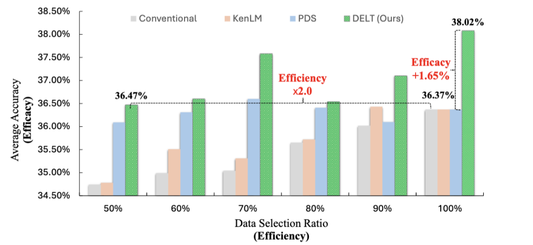 DELT范式不但通过数据选择提升效率,选取高质量数据,加快训练速度;