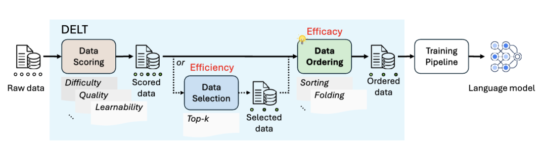 数据选择通过评分筛选出最优子集(如:top-k、按阈值筛选等),然后数据排序根据评分重新组织所选择数据的呈现顺序(如:基于课程学习的分数从低到高排列)。 为了兼顾数据处理效率,DELT范式的数据选择和数据排序共用数据评分的结果。
