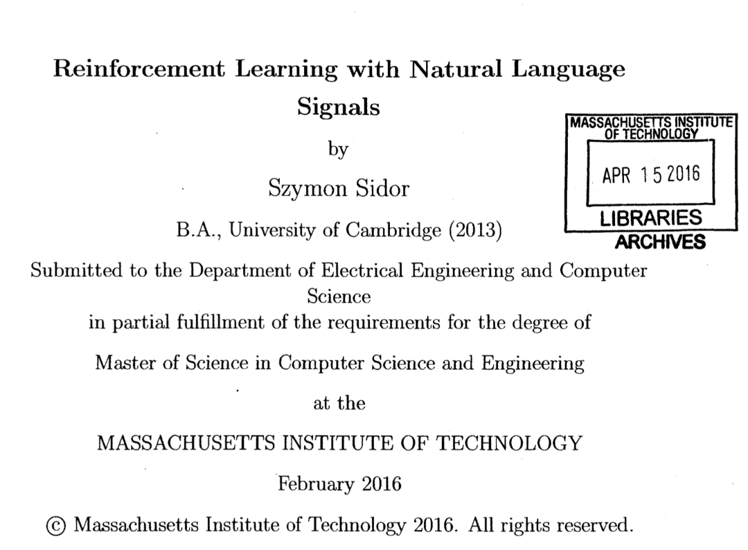 最终毕业时他的论文课题是“自然语言处理中多阶段推理的强化学习方法”,这个题目拿到现在当成最新的大模型研究题目都没问题。