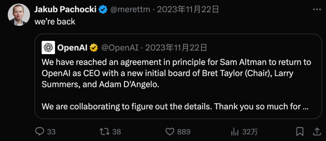 后来两人步调一致,与Aleksander Madry一起率先宣布辞职,要追随奥特曼一起加入微软,也正是他们坚定的支持成为促使Altman回归的关键因素之一。