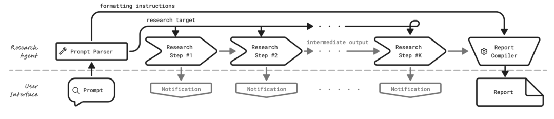 上图呈现的是一个典型深度研究工具(DRT)的组成部分,与普通的对话式LLMs不同,DRTs在生成报告之前倾向于持续向用户更新其进度。