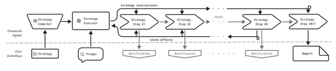 用户可控的策略驱动研究界面。下图的原型展示了四大实用功能:实时修改研究策略、选择预设策略库、接收进度通知、查看分析报告。