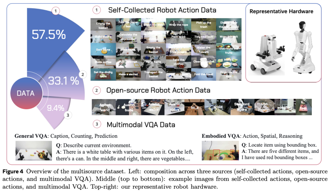WALL-OSS背后,是大规模的VLA训练集的支撑,其中主要包括大量自采高质量真机数据和具身多模态数据。