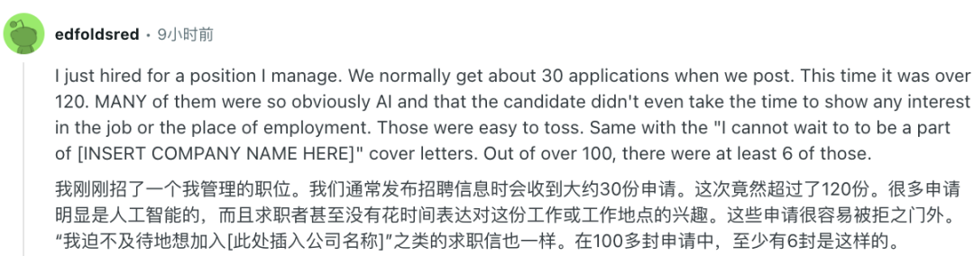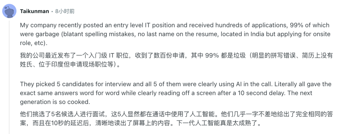 有人吐槽公司收到上百份申请,99%都是垃圾,且申请人面试时还在用AI对话,因为他们几乎一字不差的给出了完全相同的答案。