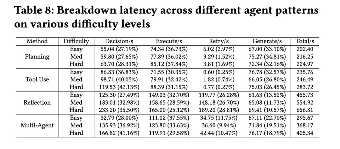 观察到不同Data Agent架构本质是通过重新分配计算开销实现优化——Reflection架构将26-29%计算用于重试机制换取高质量输出,Planning架构将32-35%用于生成阶段保证效率,这种“认知负载重分配”为根据任务场景选择合适架构提供了量化指导