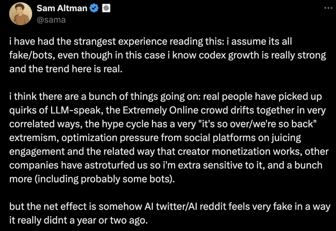 OpenAI CEO奥特曼得知后却表示:怎么有点不信呢,看着像是AI发的贴。