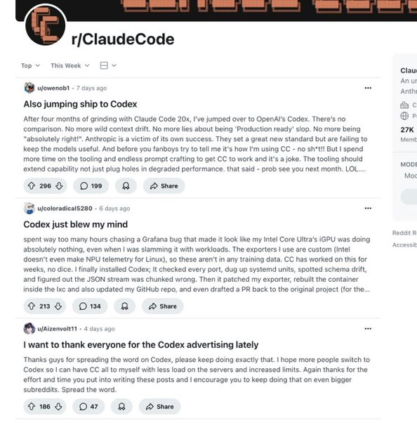 如果你在前几天打开美国贴吧Reddit的Claude Code吧,就会发现怎么全是讨论OpenAI Codex的,都要怀疑是不是走错门了。