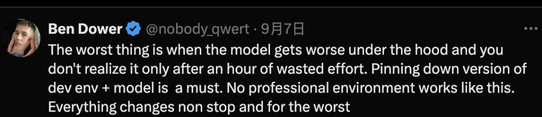 评论区有人补充,最糟糕的是模型悄悄变差,而你白白浪费了一小时才能意识到,没有哪个专业的开发环境是不能固定版本的。