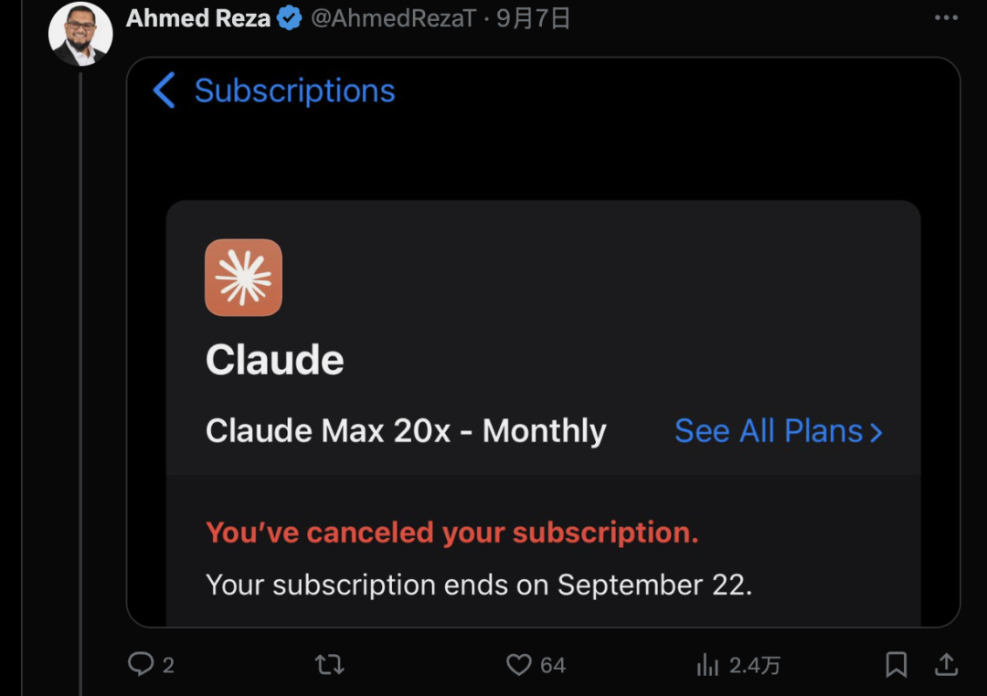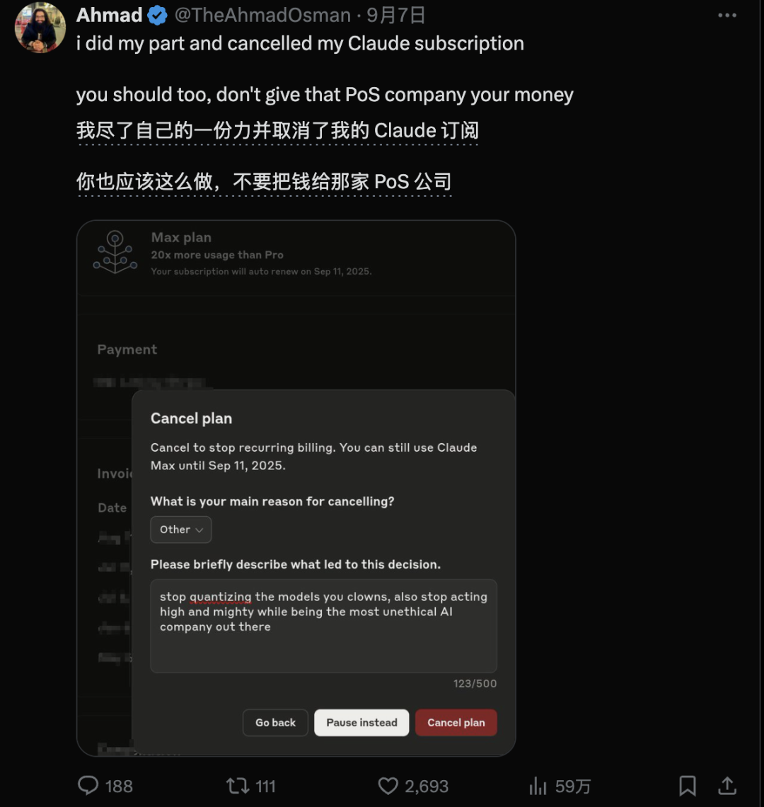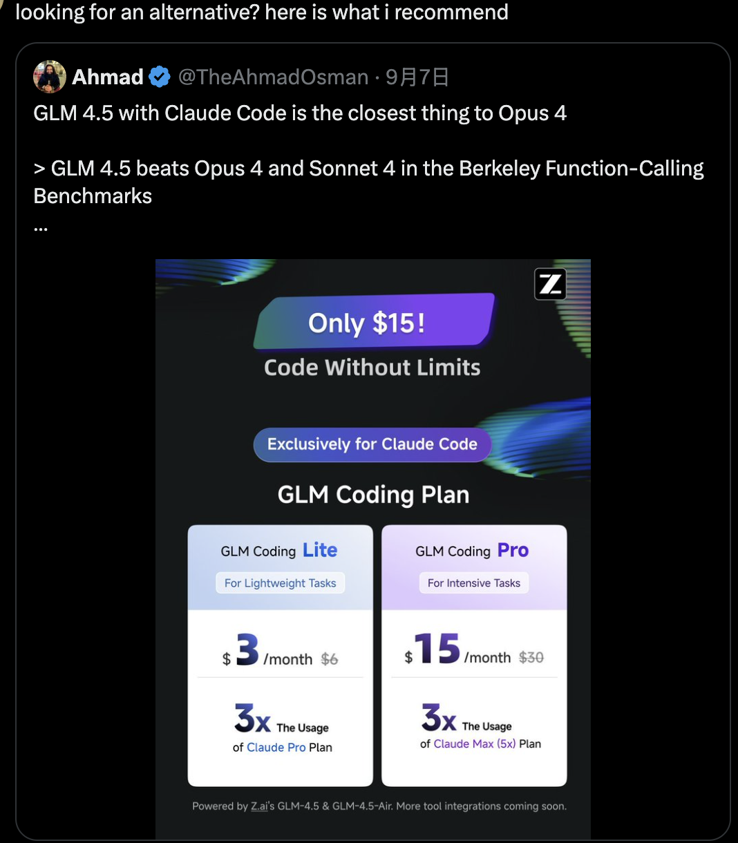带头退订Claude的Ahmad老哥就推荐了智谱的GLM 4.5。