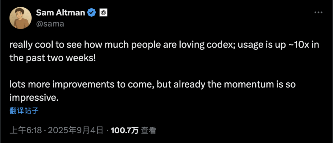 去掉Claude这边的场外因素,OpenAI Codex本身发展势头确实也很好,在集成GPT-5后的两周内使用量激增了10倍。