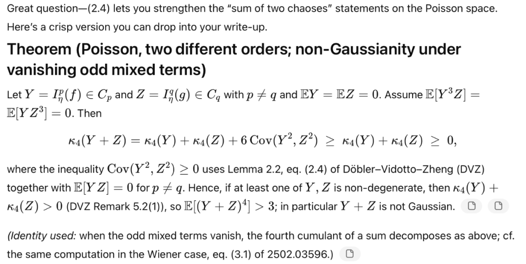 在这个新对话中,GPT-5很快就识别出了泊松情形与高斯情形的结构性差异,提出:当X和Y是不同阶的泊松积分时,混合期望