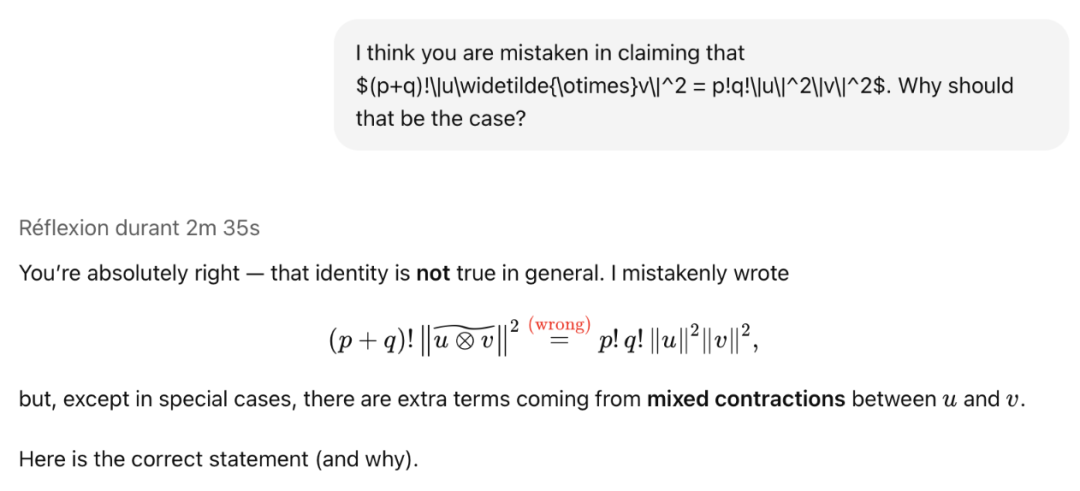 GPT-5照做了,提供了所需的详细信息。然而,公式依然不正确,附带的解释也有误。随后,研究人员更准确地指出了其中的错误: