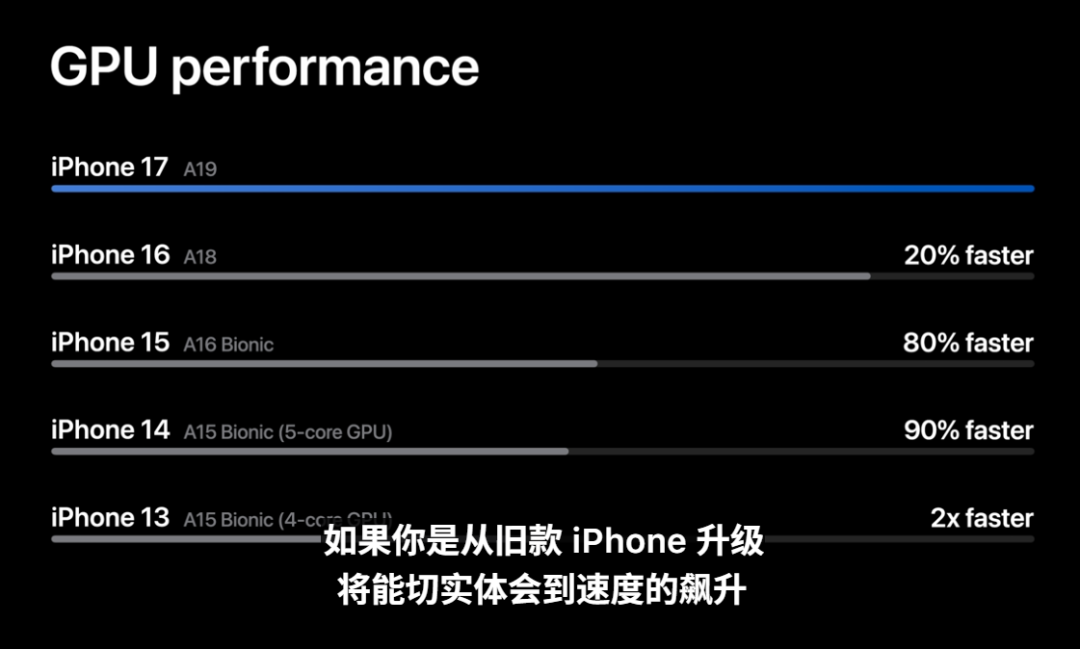 苹果官方表示,相比于A18,A19芯片有20%的性能提升。