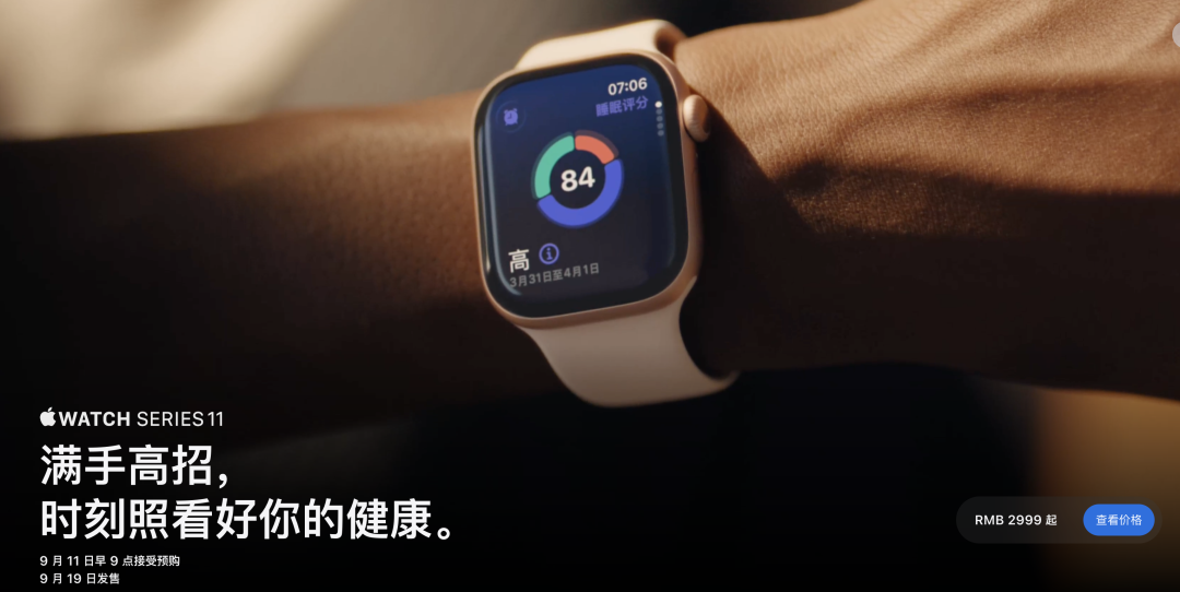 基础款Series 11,按发布人的说法是苹果迄今为止最薄、最舒适的一款手表,国行版本起售价2999元。