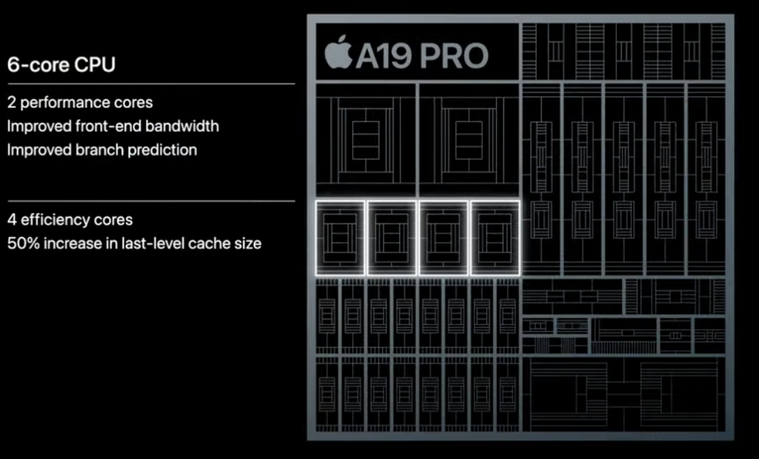 芯片同样用的是A19 Pro,不过相比Air多了一个图形处理器,是6CPU+6GPU的组合。