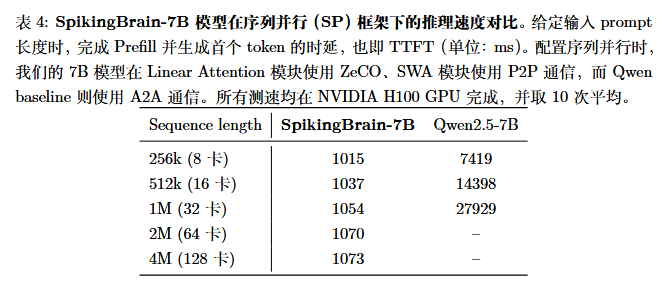 SpikingBrain-1.0-7B模型在Huggingface框架下适配了多卡序列并行推理(使用ZeCO加上P2P通信),并支持4M长度的Prefill。结果显示,相比于使用标准注意力和A2A通信的Qwen baseline,SpikingTime-1.0-7B在512K和1M长度下TTFT(提交提示到生成第一个Token所需的时间)加速分别达到13.88倍和26.5倍,且随序列长度和卡数扩展具有几乎恒定的时间开销,在4M长度下Qwen baseline已经难以评测,根据拟合scaling曲线,保守估计速度提升超过100倍(表4)。