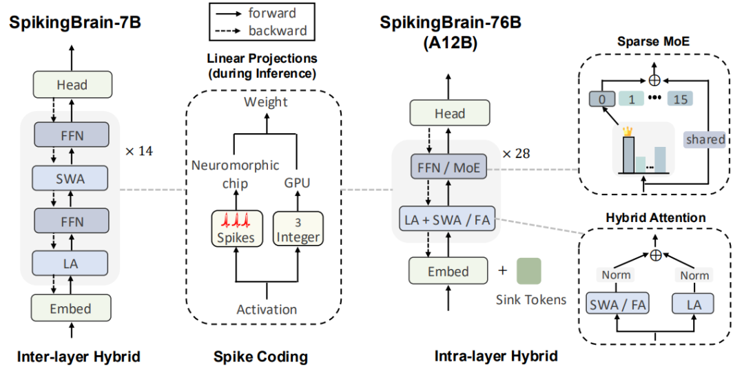 其中SpikingBrain-7B由线性注意力和滑窗注意力1:1层间堆叠而成。