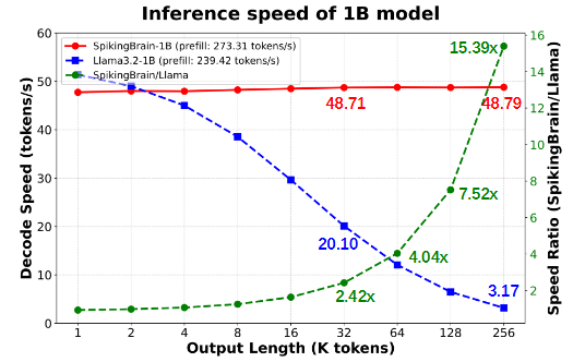 SpikingBrain借鉴大脑信息处理机制,具有线性/近线性复杂度,在超长序列上具有显著速度优势。