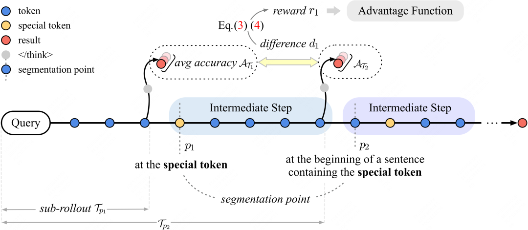 在CoT中,一些特殊的token,比如“However”、“Therefore”、“So”、“But”、“Wait”等往往表示模型已经完成了一个推理步骤,即将进行下一步推理(递进或是转折)。这些特殊token的存在将整个轨迹划分成了多个中间步骤。