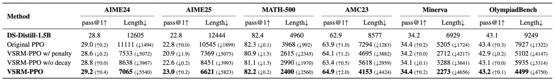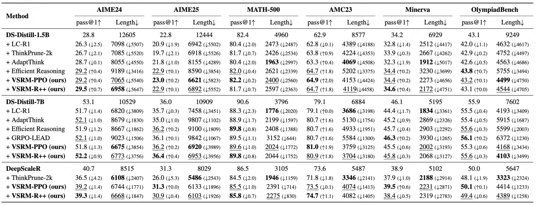 通过在数学任务上的实验显示,在多个常用benchmark上,VSRM加持的后训练使得不同尺度的模型实现了输出长度的大幅缩减,甚至在部分情况下提升了模型表现。