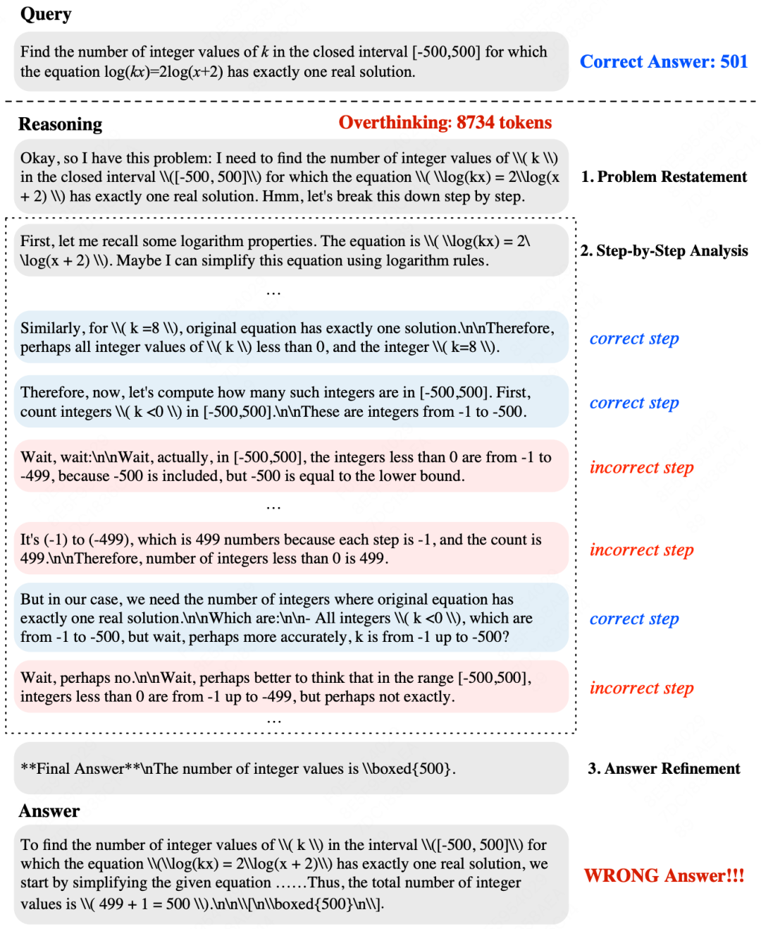 如图所示,在这个例子中,模型为解决一个非常简单的子问题([-500,0]中有多少个小于0的整数)进行了反复的思考,在正确和错误之间反复横跳,最终得出了一个不正确的中间结论,进而导致了最终结论的错误。