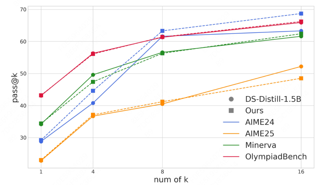 在困难benchamrk上,随着k的增加,Pass@k指标的提升趋势能够反馈模型探索更多可行解的能力。可以看到VSRM-PPO训练后的模型,体现了与原本模型一致的趋势,说明模型并没有因为输出长度的压缩而失去了最重要的探索能力。