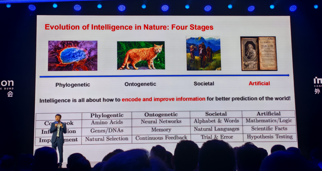 他将人工智能的发展与生命演化类比:DNA可以视为自然界最早的“大模型”,通过适者生存和随机变异传承知识,但效率低、代价高。大模型的演化也像物种进化,大浪淘沙,成本巨大。