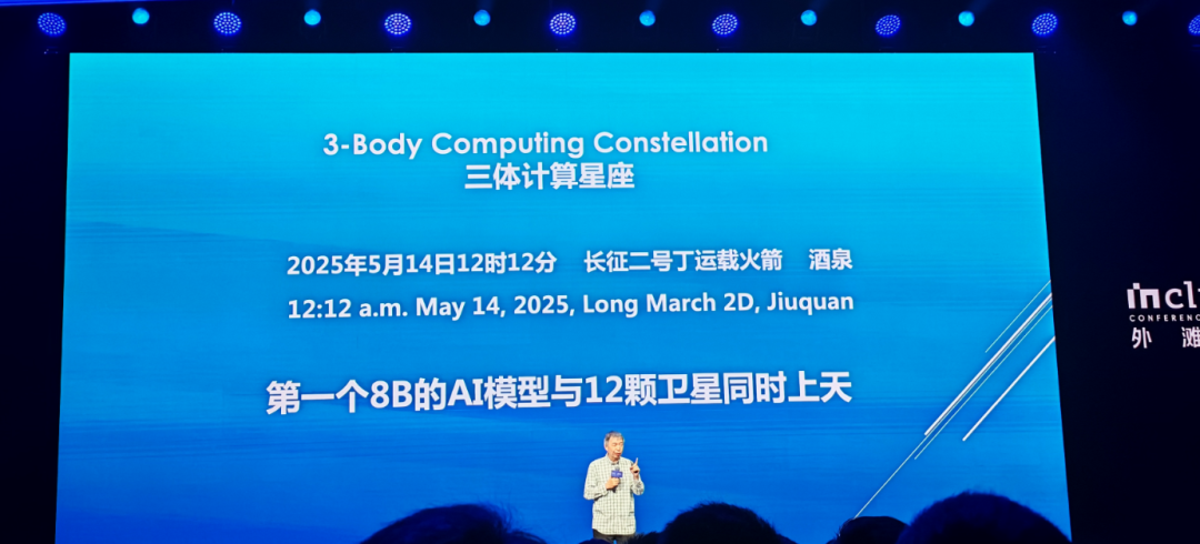 他还以自己参与的最新探索为例——今年5月,他所在的之江实验室利用“三体计算星座”计划,首次将一个完整的8B大模型与12颗卫星同时送上太空,实现了卫星之间的互联互通与在轨智能计算。他还特意解释道: