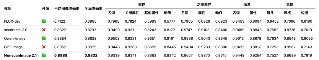 结果表明,混元图像2.1模型在语义对齐上的表现领先于开源模型,并逼近GPT-Image等闭源商业模型的效果。