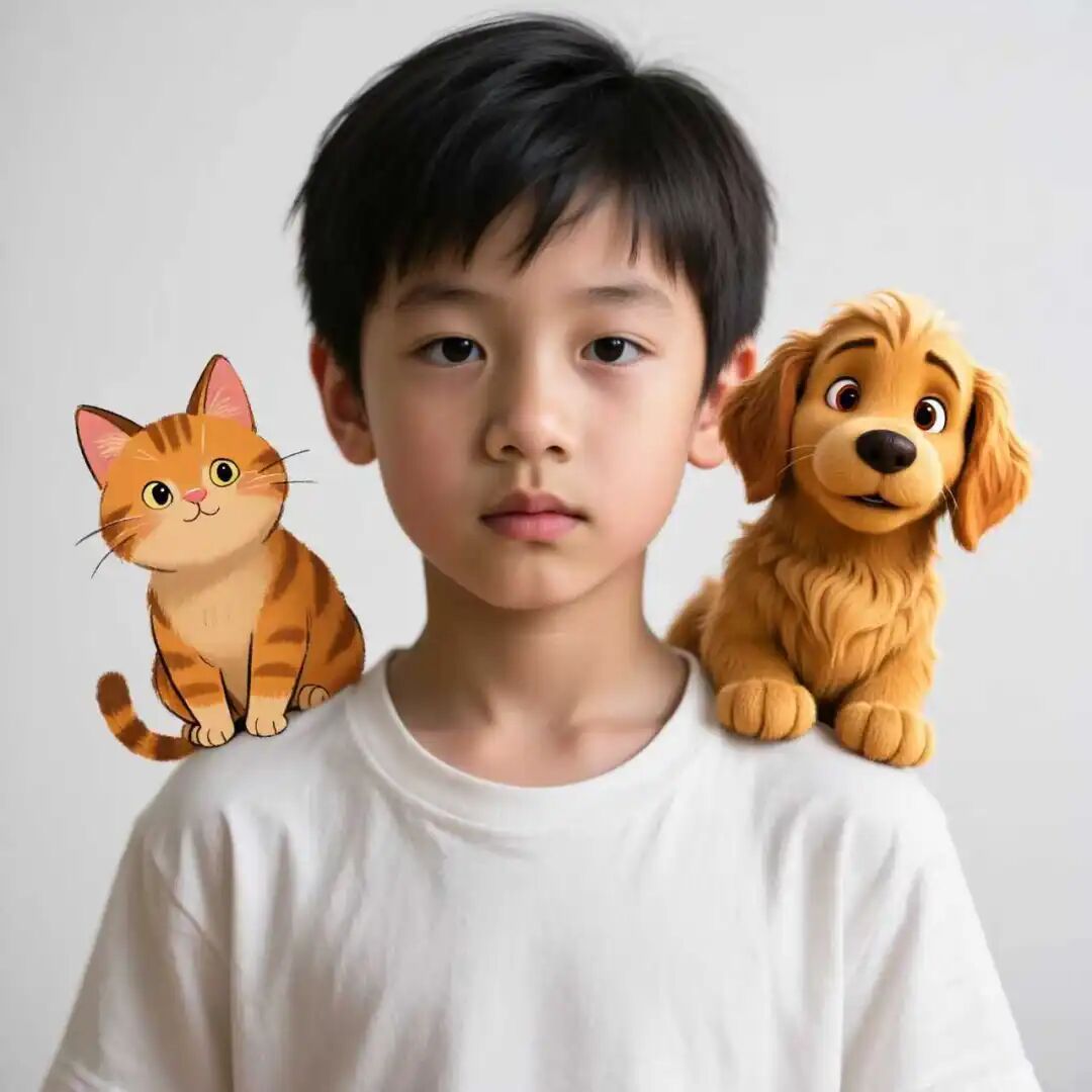 Prompt:一幅图像描绘了一个写实风格的男孩,他的左右肩膀上各坐着一只不同风格的动物。画面中央的男孩留着黑色的短发,他身穿白色T恤,服装面料具有明显的纹理和褶皱。在他的左肩上,坐着一只吉卜力卡通风格的橘色小猫,这只猫有着圆润的身体、大大的耳朵和简约的线条,色彩温暖。在他的右肩上,坐着一只迪士尼3D动画风格的金色小狗,这只狗的毛发呈现出渲染感十足的光泽和卷曲状,有着大鼻子和亮晶晶的眼睛。背景是白墙。整体画面是一幅数字绘画作品,融合了摄影级写实、手绘动画和3D渲染等多种风格。