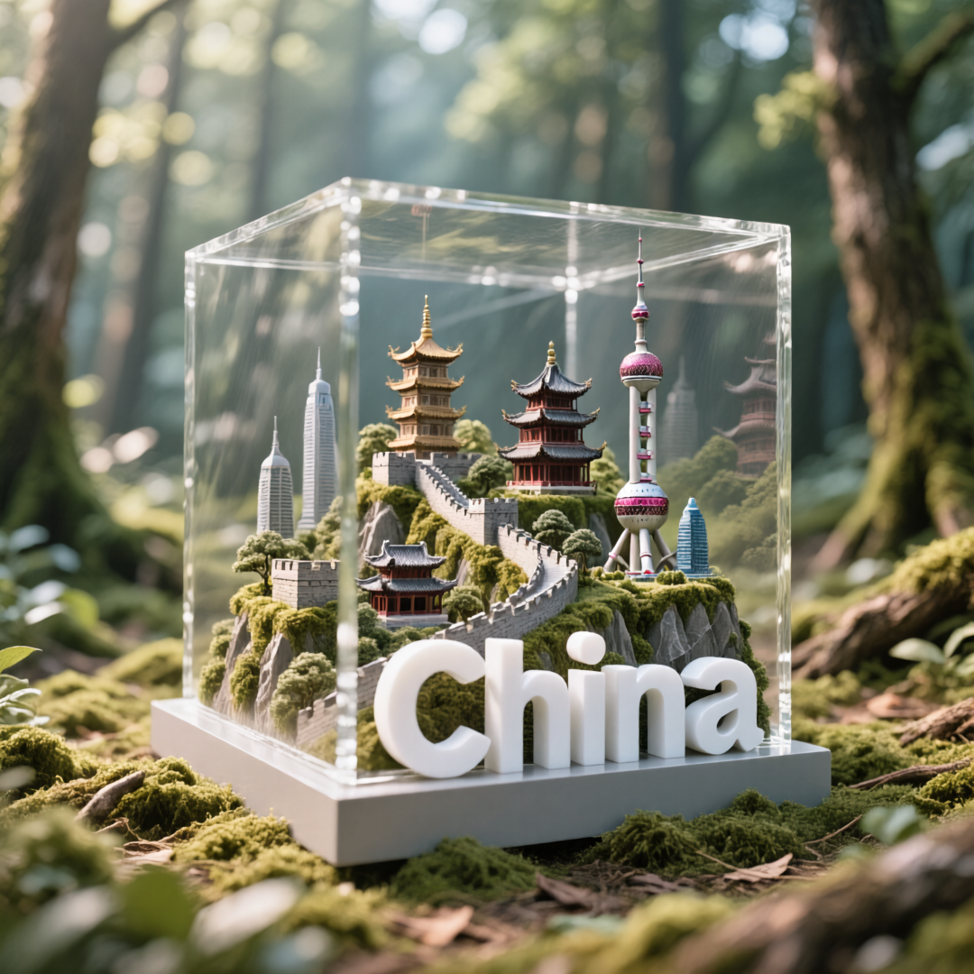 Prompt:A hyper-realistic photograph of a glass cube diorama on a lush, mossy forest floor, illuminated by dappled sunlight. Inside the transparent cube, an intricate landscape of miniature, highly detailed landmarks and cultural icons from China are meticulously arranged. This includes both traditional and modern architecture, such as the Great Wall winding across a terrain, a classic pagoda, and the sleek form of the Oriental Pearl Tower, all surrounded by miniature greenery. At the base of the diorama, the 3D word “China” is prominently displayed in large, bold, white block letters. The background forest is softly blurred, creating a bokeh effect that directs attention to the sharp details of the diorama. The overall look is crisp, elegant, and immersive, with a shallow depth of field.