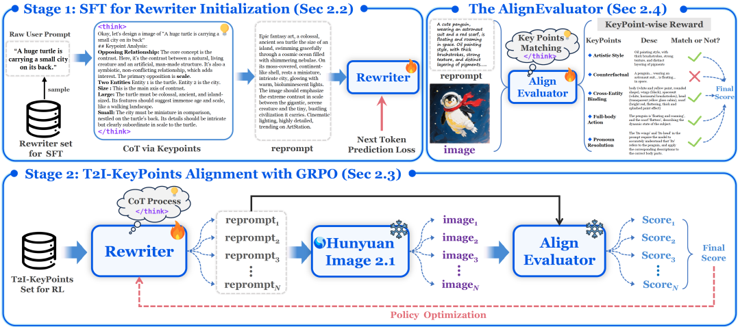 此外,开发了首个系统性工业级改写模型PromptEnhancer模块,其中SFT训练结构化地重写用户文本指令以丰富视觉表达,而GRPO训练采用细粒度语义AlignEvaluator奖励模型来大幅提升从重写文本生成的图像语义。