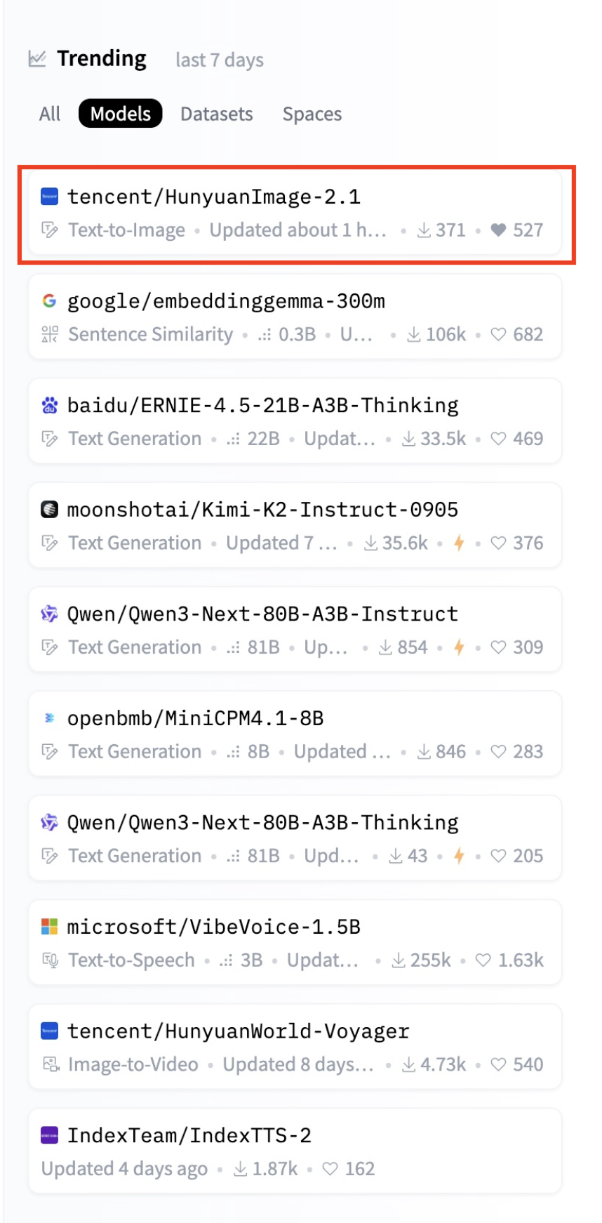 模型开源之后,在Hugging Face趋势榜上一路飙升,目前已拿下第一名的宝座。